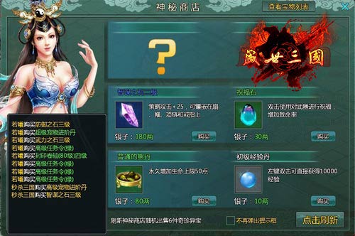 这里有各种各样的宝石、熊丹、经验丹、任务令、麒麟铠甲等等宝贝,你想得到吗?那就快来陪游《盛世三国》的神秘商店吧!当玩家光临神秘商店时,你可以根据神秘商店给你提供的宝贝页面看看是否有你想要买的宝贝,如果没有你可以点击刷新,系统就会从新换一些新宝贝供你选择。不过要提醒一下各位玩家,每刷新一下需要花费100两非绑定银子。