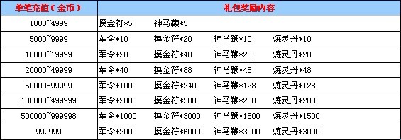 【活动内容】:活动期间单笔充值达到指定额度即可获得相应的礼包一份