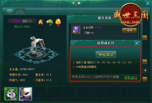 某天,当你的宠物所有资质都到达500以上,宠物将会升级为神兽,神兽的出现,带来一阵狂野的怒吼,世间万物将会因此而改变,玩家在这战乱的三国时代也必然突围而出,闯下一番功绩大业。能进化为神兽,当然是厉害的,但玩家也是要做好很多准备功夫去获得“神丹”,玩家们在游戏中可以通过匈奴入侵活动,30级英雄试炼副本和神秘商店得到“神丹”。
