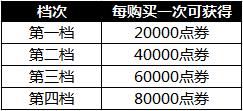 如:活动期间,玩家购买了1次第一档和2次第三档,总共可额外获得140000点券。