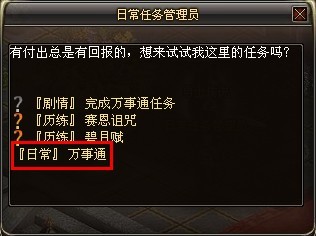万事通任务为日常任务,30级以上的玩家即可在春之城的日常任务管理员(春之城91,23)处接取任务,每天只能接取一次。