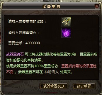 武器重置石:可以将任意武器的强化等级重置为0,同时重置前所加的强化等级附带的属性清零,但重置后的武器极品属性不会发生变化,同时也不会出现新的极品属性。