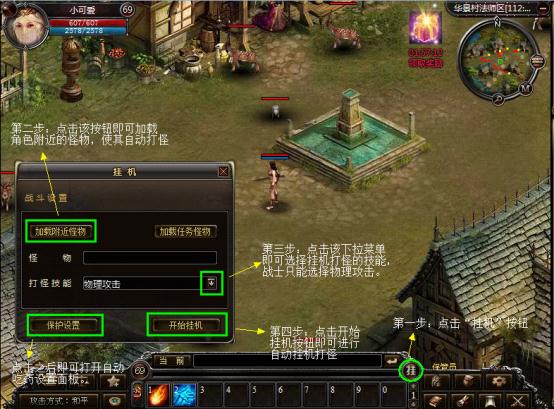 挂机的时候需要您同时设置好自动加血,包裹里还要有大量的血药、蓝药。