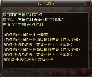 活动内容:每充值10元宝可以获得1点红利,使用红利可以在春之城(53.51)礼品兑换员处兑换超值道具。