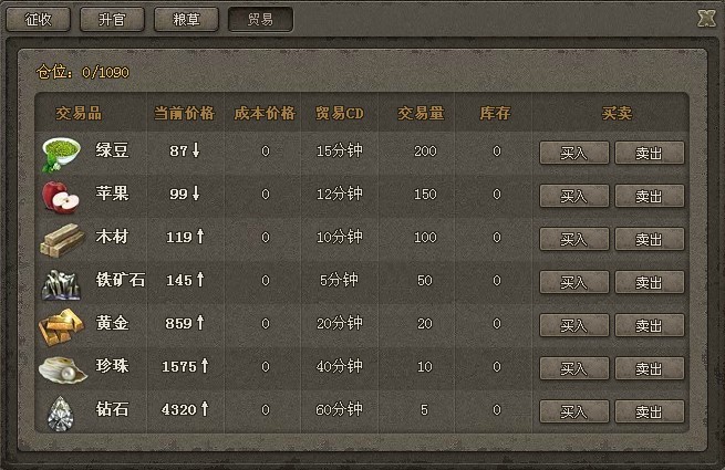 买卖粮草的地方。升级提升买卖数量并刷新当天购买量。粮食价格半小时变化,最高2.0,最低0.5。升级市场可以刷新交易量