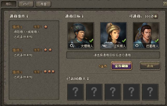 征收事件:使用征收或强征指令时有一定几率出现征收事件,选择不同的选项可能会相应增减征收次数、威望、金币、银币、民忠和征收CD。