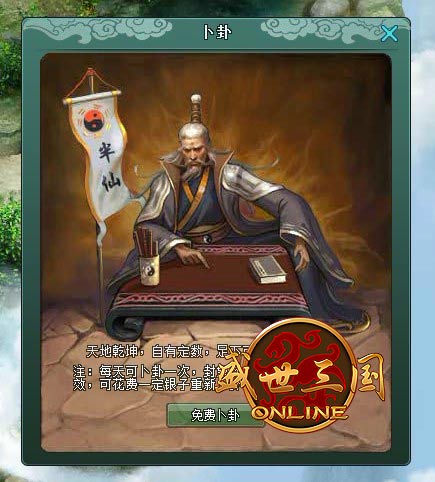 问天命积星运来陪游盛世三国免费卜卦,不用钱还可以得到游戏随机送出的礼物。在这里你每天都有机会免费得到宝贝。例如当日接取国家发展任务经验可提30%、接取征战四方任务经验可提升7%。不过如果你觉得一次玩的不过瘾,你可再次点击卜卦,不过下次就要收费了!如果你屡试不爽就根据你想卜卦的次数来算钱了。陪游盛世三国只要你来卜卦就绝对不会让你白来一趟。