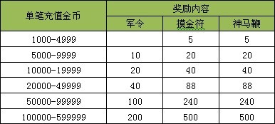 4. 活动内容:活动时间内,单笔充值订单充值金额满足以下条件即可获得相应礼包一份,多次充值可以多次领取奖励!