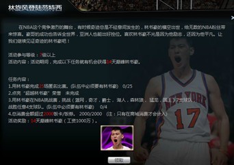 活动内容:活动时间内7级以上玩家可通过完成匿名比赛、完成NBA挑战赛条件、点亮“超越林书豪”荣誉、并商城消费金额达到一定额度即可领取“14天巅峰林书豪”。