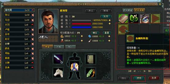 对指定武将使用技能书或阵法书就可以让武将习得技能和阵法。