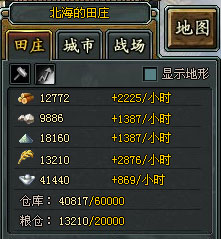 标签进入田庄场景,在右侧面板中可以可以看到各项资源产量,如图: