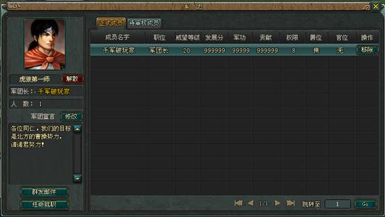 2.任命副军团长:军团长可以任命军团副军团长职务,每个军团限2名副军团长。副军团长不能解散军团和人名军团长,其他职权与军团长一致。另外,军团长无法人名自己为副军团长。