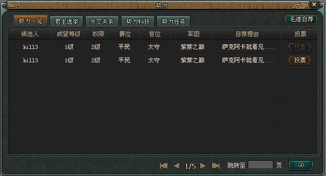 选举时间内,本势力发展积分0分以上,并且排名在前70%以上玩的家可以有资格参加投票。每次选举只能给一位参选候选人投票。