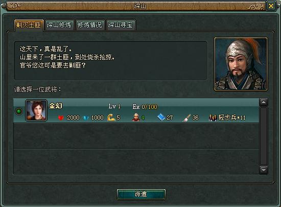 选择武将部队执行去深山中剿匪,可以很好的让武将增长经验。剿匪战斗会损失兵力、消耗粮食,士气不会变化,武将也不会因为重伤不能战斗。