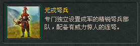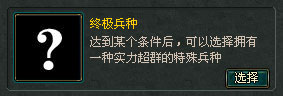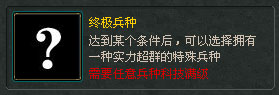 | 终极兵种 | 在步兵、弓兵或者骑兵的攻防科技都达到10级后,可以选择一个实力超群的特殊兵种。特殊兵种只能选择一次,并且不能更改。 |