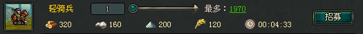 点击任意的军事建筑,可以看到各个兵种单个士兵招募所需花费的资源和时间,以及当前田庄中最多可招募该兵种的数量。在输入框中输入希望招募的士兵数量,或者拉动滑条增减希望招募的数量后,点击“招募”按钮就可以开始进行招募了。