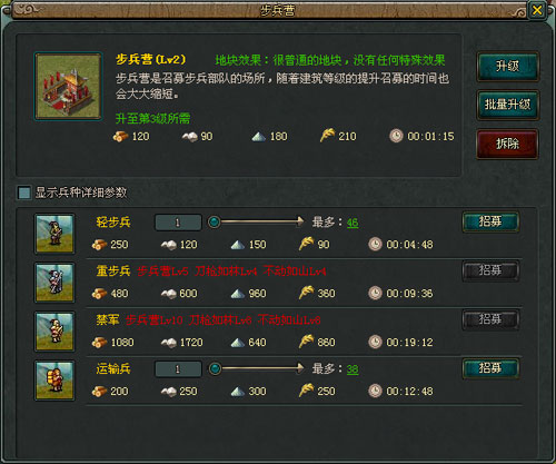 建造步兵营、弓兵营、骑兵营后可以分别招募步兵、弓兵和骑兵部队。需要注意的是,越高级的兵种,需要相应的兵营建筑物等级和相应的科技等级越高。