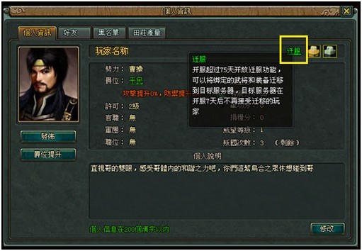 1、满足迁服条件的服务器中,并且满足迁服条件的玩家个人,会在自己的个人信息界面出现“迁服”按钮: