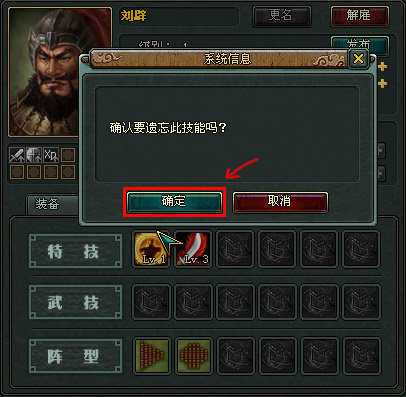 1、本次更新后,武将的技能学习方面增加功能“遗忘”, 玩家可以选择“遗忘”功能来消除武将的技能和阵型。如下图所示,点击某项需要遗忘的技能后,系统会提示您“确认要丢掉此技能吗?”,点击“确认”后,此技能从武将的技能栏中消失。确认“遗忘”后,该操作不可逆转,请大家慎重使用!